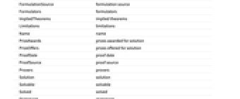 AdditionalPeople additional people involved AlternateNames alternate names AlternateStatements alternate statements AssociatedEntities associated entities AssociatedEquations associated equations AssociatedPeople associated people Classes classes Complexity complexity CurrentEvidence current evidence EntityClasses entity classes EntityTypeList entity type list FormalStatement formal statement FormulationDate formulation date FormulationSource formulation source Formulators formulators ImpliedTheorems implied theorems Limitations limitations Name name PrizeAwards prizes awarded for solution PrizeOffers prizes offered for solution ProofDate proof date ProofSource proof source Provers provers Solution solution Solvable solvable Solved solved Statement statement Status status True true Unsolvable unsolvable Unsolved unsolved