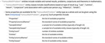 "Properties" the list of available properties "PropertyCanonicalNames" the standard names of available properties "SampleEntities" a sample list of available entities (typically of length 10) "SampleEntityClasses" a sample list of available entity classes (typically of length 10) "EntityCount" number of entities available "Entities" the list of available entities "EntityCanonicalNames" the standard names of available entities "EntityClasses" the list of available entity classes "EntityClassCanonicalNames" the standard names of available entity classes "PropertyClasses" the list of available property classes "PropertyClassCanonicalNames" the standard names of available property classes "PropertyCount" number of properties available - The following annotations can be used in the third argument of EntityValue["FamousMathProblem",property,annotation]: