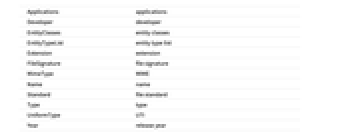 Applications applications Developer developer EntityClasses entity classes EntityTypeList entity type list Extension extension FileSignature file signature MimeType MIME Name name Standard file standard Type type UniformType UTI Year release year