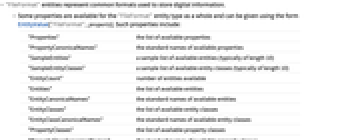 - Some properties are available for the "FileFormat" entity type as a whole and can be given using the form EntityValue["FileFormat",property]. Such properties include:
