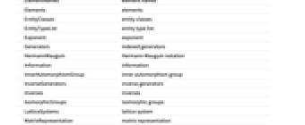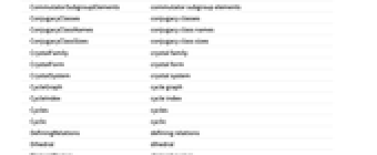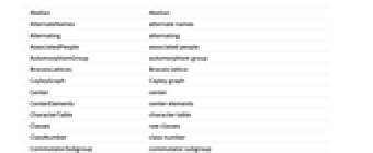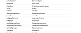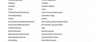 Abelian Abelian AlternateNames alternate names Alternating alternating AssociatedPeople associated people AutomorphismGroup automorphism group BravaisLattices Bravais lattice CayleyGraph Cayley graph Center center CenterElements center elements CharacterTable character table Classes raw classes ClassNumber class number CommutatorSubgroup commutator subgroup CommutatorSubgroupElements commutator subgroup elements ConjugacyClasses conjugacy classes ConjugacyClassNames conjugacy class names ConjugacyClassSizes conjugacy class sizes CrystalFamily crystal family CrystalForm crystal form CrystalSystem crystal system CycleGraph cycle graph CycleIndex cycle index Cycles cycles Cyclic cyclic DefiningRelations defining relations Dihedral dihedral ElementNames element names Elements elements EntityClasses entity classes EntityTypeList entity type list Exponent exponent Generators indexed generators HermannMauguin Hermann‐Mauguin notation Information information InnerAutomorphismGroup inner automorphism group InverseGenerators inverse generators Inverses inverses IsomorphicGroups isomorphic groups LatticeSystems lattice system MatrixRepresentation matrix representation MultiplicationTable indexed multiplication table Name name Nonabelian nonabelian Nonalternating nonalternating Noncyclic noncyclic Nondihedral nondihedral Nonperfect nonperfect Nonsimple nonsimple Nonsolvable nonsolvable Nonsporadic nonsporadic Nonsymmetric nonsymmetric Nontransitive nontransitive NormalSubgroupElements normal subgroup elements NormalSubgroups normal subgroups Notation notation Orbifold orbifold notation Order order OuterAutomorphismGroup outer automorphism group ParameterRange parameter range Perfect perfect PermutationGroupRepresentation permutation group representation PermutationRepresentation permutation representation PointGroupType type QuotientGroups quotient groups RepresentationDimensions representation dimensions RepresentationNames representation names Schoenflies Schönflies notation SchurMultiplier Schur multiplier ShortName short name Shubnikov Shubnikov magnetic group Simple simple Solvable solvable SpaceRepresentation space representation Sporadic sporadic SubgroupElements subgroup elements Subgroups subgroups SylowSubgroupCounts Sylow subgroup counts SylowSubgroupElements Sylow subgroup elements SylowSubgroups Sylow subgroups Symmetric symmetric Transitive transitive Transitivity transitivity