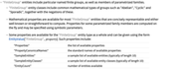 - Mathematical properties are available for most "FiniteGroup" entities that are concisely representable and either well known or straightforward to compute. Properties for some parametrized family members are computed on the fly and may be specified using symbolic parameters.