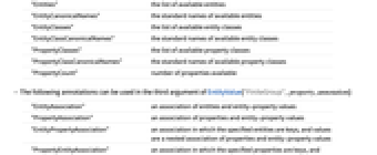 "EntityAssociation" an association of entities and entity-property values "PropertyAssociation" an association of properties and entity-property values "EntityPropertyAssociation" an association in which the specified entities are keys, and values are a nested association of properties and entity-property values "PropertyEntityAssociation" an association in which the specified properties are keys, and values are a nested association of entities and entity-property values "Dataset" a dataset in which the specified entities are keys, and values are an association of property names and entity-property values - The following annotations can be used in the second argument of EntityValue[property,annotation]: