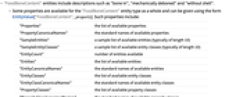 - Some properties are available for the "FoodBoneContent" entity type as a whole and can be given using the form EntityValue["FoodBoneContent",property]. Such properties include: