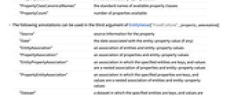 "Source" source information for the property "Date" the date associated with the entity-property value (if any) "EntityAssociation" an association of entities and entity-property values "PropertyAssociation" an association of properties and entity-property values "EntityPropertyAssociation" an association in which the specified entities are keys, and values are a nested association of properties and entity-property values "PropertyEntityAssociation" an association in which the specified properties are keys, and values are a nested association of entities and entity-property values "Dataset" a dataset in which the specified entities are keys, and values are an association of property names and entity-property values - The following annotations can be used in the second argument of EntityValue[property,annotation]: