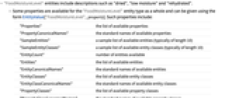 "Properties" the list of available properties "PropertyCanonicalNames" the standard names of available properties "SampleEntities" a sample list of available entities (typically of length 10) "SampleEntityClasses" a sample list of available entity classes (typically of length 10) "EntityCount" number of entities available "Entities" the list of available entities "EntityCanonicalNames" the standard names of available entities "EntityClasses" the list of available entity classes "EntityClassCanonicalNames" the standard names of available entity classes "PropertyClasses" the list of available property classes "PropertyClassCanonicalNames" the standard names of available property classes "PropertyCount" number of properties available - The following annotations can be used in the third argument of EntityValue["FoodMoistureLevel",property,annotation]:
