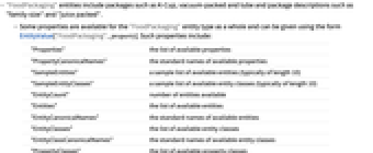 - Some properties are available for the "FoodPackaging" entity type as a whole and can be given using the form EntityValue["FoodPackaging",property]. Such properties include: