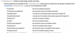 "Properties" the list of available properties "PropertyCanonicalNames" the standard names of available properties "SampleEntities" a sample list of available entities (typically of length 10) "SampleEntityClasses" a sample list of available entity classes (typically of length 10) "EntityCount" number of entities available "Entities" the list of available entities "EntityCanonicalNames" the standard names of available entities "EntityClasses" the list of available entity classes "EntityClassCanonicalNames" the standard names of available entity classes "PropertyClasses" the list of available property classes "PropertyClassCanonicalNames" the standard names of available property classes "PropertyCount" number of properties available - The following annotations can be used in the third argument of EntityValue["FoodPattyCount",property,annotation]: