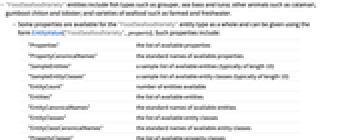 "Properties" the list of available properties "PropertyCanonicalNames" the standard names of available properties "SampleEntities" a sample list of available entities (typically of length 10) "SampleEntityClasses" a sample list of available entity classes (typically of length 10) "EntityCount" number of entities available "Entities" the list of available entities "EntityCanonicalNames" the standard names of available entities "EntityClasses" the list of available entity classes "EntityClassCanonicalNames" the standard names of available entity classes "PropertyClasses" the list of available property classes "PropertyClassCanonicalNames" the standard names of available property classes "PropertyCount" number of properties available - The following annotations can be used in the third argument of EntityValue["FoodSeafoodVariety",property,annotation]: