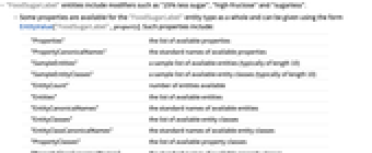 - Some properties are available for the "FoodSugarLabel" entity type as a whole and can be given using the form EntityValue["FoodSugarLabel",property]. Such properties include: