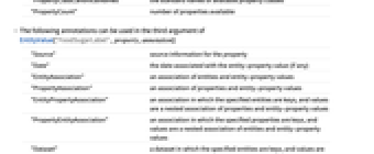 "Source" source information for the property "Date" the date associated with the entity-property value (if any) "EntityAssociation" an association of entities and entity-property values "PropertyAssociation" an association of properties and entity-property values "EntityPropertyAssociation" an association in which the specified entities are keys, and values are a nested association of properties and entity-property values "PropertyEntityAssociation" an association in which the specified properties are keys, and values are a nested association of entities and entity-property values "Dataset" a dataset in which the specified entities are keys, and values are an association of property names and entity-property values - The following annotations can be used in the second argument of EntityValue[property,annotation]: