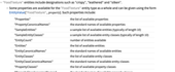 "Properties" the list of available properties "PropertyCanonicalNames" the standard names of available properties "SampleEntities" a sample list of available entities (typically of length 10) "SampleEntityClasses" a sample list of available entity classes (typically of length 10) "EntityCount" number of entities available "Entities" the list of available entities "EntityCanonicalNames" the standard names of available entities "EntityClasses" the list of available entity classes "EntityClassCanonicalNames" the standard names of available entity classes "PropertyClasses" the list of available property classes "PropertyClassCanonicalNames" the standard names of available property classes "PropertyCount" number of properties available - The following annotations can be used in the third argument of EntityValue["FoodTexture",property,annotation]: