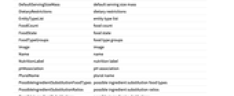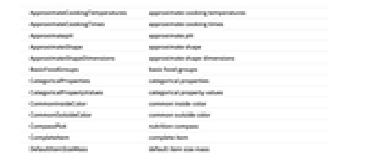 ApproximateCookingTemperatures approximate cooking temperatures ApproximateCookingTimes approximate cooking times ApproximatepH approximate pH ApproximateShape approximate shape ApproximateShapeDimensions approximate shape dimensions BasicFoodGroups basic food groups CategoricalProperties categorical properties CategoricalPropertyValues categorical property values CommonInsideColor common inside color CommonOutsideColor common outside color CompassPlot nutrition compass CompleteItem complete item DefaultItemSizeMass default item size mass DefaultServingSizeMass default serving size mass DietaryRestrictions dietary restrictions EntityTypeList entity type list FoodCount food count FoodState food state FoodTypeGroups food type groups Image image Name name NutritionLabel nutrition label pHAssociation pH association PluralName plural name PossibleIngredientSubstitutionFoodTypes possible ingredient substitution food types PossibleIngredientSubstitutionRatios possible ingredient substitution ratios PossibleIngredientSubstitutions possible ingredient substitutions PossibleInsideColors possible inside colors PossibleOutsideColors possible outside colors RelatedPokemon related Pokémon RelatedSolid related solid StrictFoodCount strict food count StrictFoods strict foods Transparency transparency