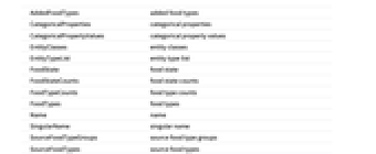 AddedFoodTypes added food types CategoricalProperties categorical properties CategoricalPropertyValues categorical property values EntityClasses entity classes EntityTypeList entity type list FoodState food state FoodStateCounts food state counts FoodTypeCounts food type counts FoodTypes food types Name name SingularName singular name SourceFoodTypeGroups source food type groups SourceFoodTypes source food types Transparency transparency