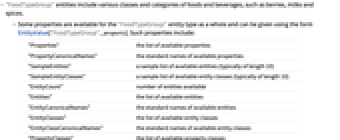 "Properties" the list of available properties "PropertyCanonicalNames" the standard names of available properties "SampleEntities" a sample list of available entities (typically of length 10) "SampleEntityClasses" a sample list of available entity classes (typically of length 10) "EntityCount" number of entities available "Entities" the list of available entities "EntityCanonicalNames" the standard names of available entities "EntityClasses" the list of available entity classes "EntityClassCanonicalNames" the standard names of available entity classes "PropertyClasses" the list of available property classes "PropertyClassCanonicalNames" the standard names of available property classes "PropertyCount" number of properties available - The following annotations can be used in the third argument of EntityValue["FoodTypeGroup",property,annotation]: