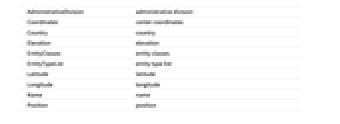 AdministrativeDivision administrative division Coordinates center coordinates Country country Elevation elevation EntityClasses entity classes EntityTypeList entity type list Latitude latitude Longitude longitude Name name Position position