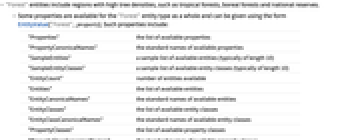 "Properties" the list of available properties "PropertyCanonicalNames" the standard names of available properties "SampleEntities" a sample list of available entities (typically of length 10) "SampleEntityClasses" a sample list of available entity classes (typically of length 10) "EntityCount" number of entities available "Entities" the list of available entities "EntityCanonicalNames" the standard names of available entities "EntityClasses" the list of available entity classes "EntityClassCanonicalNames" the standard names of available entity classes "PropertyClasses" the list of available property classes "PropertyClassCanonicalNames" the standard names of available property classes "PropertyCount" number of properties available - The following annotations can be used in the third argument of EntityValue["Forest",property,annotation]: