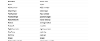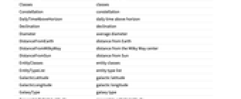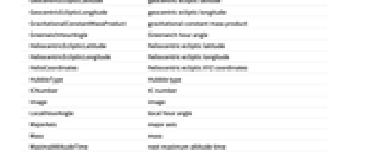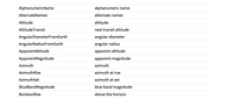 AlphanumericName alphanumeric name AlternateNames alternate names Altitude altitude AltitudeTransit next transit altitude AngularDiameterFromEarth angular diameter AngularRadiusFromEarth angular radius ApparentAltitude apparent altitude ApparentMagnitude apparent magnitude Azimuth azimuth AzimuthRise azimuth at rise AzimuthSet azimuth at set BlueBandMagnitude blue band magnitude BooleanRise above the horizon Classes classes Constellation constellation DailyTimeAboveHorizon daily time above horizon Declination declination Diameter average diameter DistanceFromEarth distance from Earth DistanceFromMilkyWay distance from the Milky Way center DistanceFromSun distance from Sun EntityClasses entity classes EntityTypeList entity type list GalacticLatitude galactic latitude GalacticLongitude galactic longitude GalaxyType galaxy type GeocentricEclipticLatitude geocentric ecliptic latitude GeocentricEclipticLongitude geocentric ecliptic longitude GravitationalConstantMassProduct gravitational constant mass product GreenwichHourAngle Greenwich hour angle HeliocentricEclipticLatitude heliocentric ecliptic latitude HeliocentricEclipticLongitude heliocentric ecliptic longitude HelioCoordinates heliocentric ecliptic XYZ coordinates HubbleType Hubble type ICNumber IC number Image image LocalHourAngle local hour angle MajorAxis major axis Mass mass MaximalAltitudeTime next maximum altitude time MinorAxis minor axis Name name NGCNumber NGC number ObjectType object type PGCNumber PGC number PositionAngle position angle RadialVelocity radial velocity Radius average radius Redshift redshift RightAscension right ascension RiseTime next rise SetTime next set Shape shape SiderealHourAngle sidereal hour angle SurfaceBrightness surface brightness TransitTime next transit time VisualBandMagnitude visual band magnitude ZenithAngle zenith angle