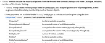 "Properties" the list of available properties "PropertyCanonicalNames" the standard names of available properties "SampleEntities" a sample list of available entities (typically of length 10) "SampleEntityClasses" a sample list of available entity classes (typically of length 10) "EntityCount" number of entities available "Entities" the list of available entities "EntityCanonicalNames" the standard names of available entities "EntityClasses" the list of available entity classes "EntityClassCanonicalNames" the standard names of available entity classes "PropertyClasses" the list of available property classes "PropertyClassCanonicalNames" the standard names of available property classes "PropertyCount" number of properties available - The following annotations can be used in the third argument of EntityValue["Galaxy",property,annotation]: