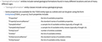- "GeologicalFormation" entities include named geological formations found in many different locations and are of many different ages.