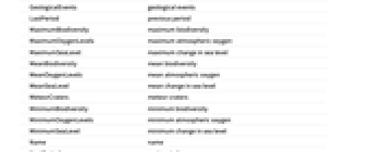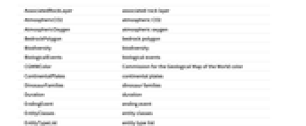 AssociatedRockLayer associated rock layer AtmosphericCO2 atmospheric CO2 AtmosphericOxygen atmospheric oxygen BedrockPolygon bedrock polygon Biodiversity biodiversity BiologicalEvents biological events CGMWColor Commission for the Geological Map of the World color ContinentalPlates continental plates DinosaurFamilies dinosaur families Duration duration EndingEvent ending event EntityClasses entity classes EntityTypeList entity type list GeologicalEvents geological events LastPeriod previous period MaximumBiodiversity maximum biodiversity MaximumOxygenLevels maximum atmospheric oxygen MaximumSeaLevel maximum change in sea level MeanBiodiversity mean biodiversity MeanOxygenLevels mean atmospheric oxygen MeanSeaLevel mean change in sea level MeteorCraters meteor craters MinimumBiodiversity minimum biodiversity MinimumOxygenLevels minimum atmospheric oxygen MinimumSeaLevel minimum change in sea level Name name NextPeriod next period ParentDivision parent division ParentEon parent eon ParentEpoch parent epoch ParentEra parent era ParentPeriod parent period SeaLevel sea level StartingEvent starting event Subdivisions subdivisions TemperatureAnomaly temperature anomaly TimeRange time range Type division type