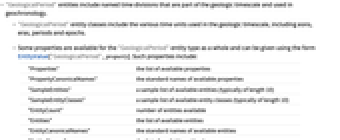 "Properties" the list of available properties "PropertyCanonicalNames" the standard names of available properties "SampleEntities" a sample list of available entities (typically of length 10) "SampleEntityClasses" a sample list of available entity classes (typically of length 10) "EntityCount" number of entities available "Entities" the list of available entities "EntityCanonicalNames" the standard names of available entities "EntityClasses" the list of available entity classes "EntityClassCanonicalNames" the standard names of available entity classes "PropertyClasses" the list of available property classes "PropertyClassCanonicalNames" the standard names of available property classes "PropertyCount" number of properties available - The following annotations can be used in the third argument of EntityValue["GeologicalPeriod",property,annotation]: