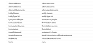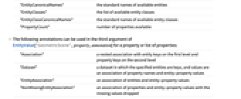 "EntityPropertyAssociation" an association in which the specified entities are keys, and values are a nested association of properties and entity-property values "NonMissingPropertyAssociation" an association of entities and entity-property values with the missing values dropped "PropertyAssociation" an association of properties and entity-property values "PropertyEntityAssociation" an association in which the specified properties are keys, and values are a nested association of entities and entity-property values - The following annotation can be used in the second argument of EntityValue[property,annotation]: