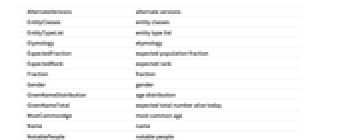 AlternateVersions alternate versions EntityClasses entity classes EntityTypeList entity type list Etymology etymology ExpectedFraction expected population fraction ExpectedRank expected rank Fraction fraction Gender gender GivenNameDistribution age distribution GivenNameTotal expected total number alive today MostCommonAge most common age Name name NotablePeople notable people Number current naming frequency Rank rank