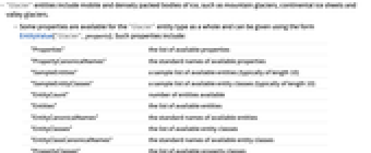 - Some properties are available for the "Glacier" entity type as a whole and can be given using the form EntityValue["Glacier",property]. Such properties include:
