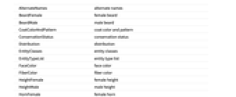 AlternateNames alternate names BeardFemale female beard BeardMale male beard CoatColorAndPattern coat color and pattern ConservationStatus conservation status Distribution distribution EntityClasses entity classes EntityTypeList entity type list FaceColor face color FiberColor fiber color HeightFemale female height HeightMale male height HornFemale female horn HornMale male horn Image image MilkYield milk yield Name name Origin origin RecognizedBy recognized by Tassel tassel Uses uses WeightFemale female weight WeightMale male weight