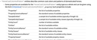 "Properties" the list of available properties "PropertyCanonicalNames" the standard names of available properties "SampleEntities" a sample list of available entities (typically of length 10) "SampleEntityClasses" a sample list of available entity classes (typically of length 10) "EntityCount" number of entities available "Entities" the list of available entities "EntityCanonicalNames" the standard names of available entities "EntityClasses" the list of available entity classes "EntityClassCanonicalNames" the standard names of available entity classes "PropertyClasses" the list of available property classes "PropertyClassCanonicalNames" the standard names of available property classes "PropertyCount" number of properties available - The following annotations can be used in the third argument of EntityValue["HorseCoatColorAndPattern",property,annotation]: