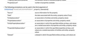 "Source" source information for the property "Date" the date associated with the entity-property value (if any) "EntityAssociation" an association of entities and entity-property values "PropertyAssociation" an association of properties and entity-property values "EntityPropertyAssociation" an association in which the specified entities are keys, and values are a nested association of properties and entity-property values "PropertyEntityAssociation" an association in which the specified properties are keys, and values are a nested association of entities and entity-property values "Dataset" a dataset in which the specified entities are keys, and values are an association of property names and entity-property values - The following annotations can be used in the second argument of EntityValue[property,annotation]: