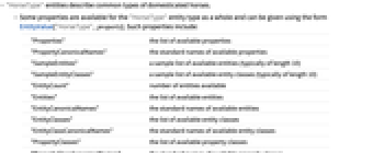 "Properties" the list of available properties "PropertyCanonicalNames" the standard names of available properties "SampleEntities" a sample list of available entities (typically of length 10) "SampleEntityClasses" a sample list of available entity classes (typically of length 10) "EntityCount" number of entities available "Entities" the list of available entities "EntityCanonicalNames" the standard names of available entities "EntityClasses" the list of available entity classes "EntityClassCanonicalNames" the standard names of available entity classes "PropertyClasses" the list of available property classes "PropertyClassCanonicalNames" the standard names of available property classes "PropertyCount" number of properties available - The following annotations can be used in the third argument of EntityValue["HorseType",property,annotation]: