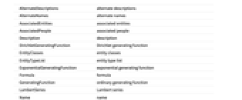 AlternateDescriptions alternate descriptions AlternateNames alternate names AssociatedEntities associated entities AssociatedPeople associated people Description description DirichletGeneratingFunction Dirichlet generating function EntityClasses entity classes EntityTypeList entity type list ExponentialGeneratingFunction exponential generating function Formula formula GeneratingFunction ordinary generating function LambertSeries Lambert series Name name Notations notations RecurrenceRelation recurrence relation SequencePlot plot Terms terms WolframLanguageCommand Wolfram Language command string WolframLanguageFunction Wolfram Language function WolframLanguagePredicateFunction Wolfram Language sequence membership test WolframLanguageTable Wolfram Language table