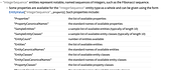 "Properties" the list of available properties "PropertyCanonicalNames" the standard names of available properties "SampleEntities" a sample list of available entities (typically of length 10) "SampleEntityClasses" a sample list of available entity classes (typically of length 10) "EntityCount" number of entities available "Entities" the list of available entities "EntityCanonicalNames" the standard names of available entities "EntityClasses" the list of available entity classes "EntityClassCanonicalNames" the standard names of available entity classes "PropertyClasses" the list of available property classes "PropertyClassCanonicalNames" the standard names of available property classes "PropertyCount" number of properties available - The following annotations can be used in the third argument of EntityValue["IntegerSequence",property,annotation]: