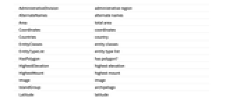 AdministrativeDivision administrative region AlternateNames alternate names Area total area Coordinates coordinates Countries country EntityClasses entity classes EntityTypeList entity type list HasPolygon has polygon? HighestElevation highest elevation HighestMount highest mount Image image IslandGroup archipelago Latitude latitude Longitude longitude Name name Polygon polygon Population population PopulationDensity population density Position position ShoreLength shore length