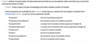 - Some properties are available for the "Island" entity type as a whole and can be given using the form EntityValue["Island",property]. Such properties include: