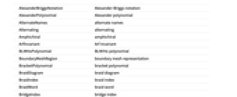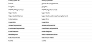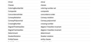 AlexanderBriggsNotation Alexander‐Briggs notation AlexanderPolynomial Alexander polynomial AlternateNames alternate names Alternating alternating Amphichiral amphichiral ArfInvariant Arf invariant BLMHoPolynomial BLM/Ho polynomial BoundaryMeshRegion boundary mesh representation BracketPolynomial bracket polynomial BraidDiagram braid diagram BraidIndex braid index BraidWord braid word BridgeIndex bridge index Chiral chiral Classes classes ColoringNumberSet coloring number set Composite composite ConcordanceOrder concordance order ConwayNotation Conway notation ConwayPolynomial Conway polynomial CrossingNumber crossing number DegreeThreeVassiliev degree‐3 Vassiliev invariant DegreeTwoVassiliev degree‐2 Vassiliev invariant Determinant determinant DowkerNotation Dowker notation EntityClasses entity classes EntityTypeList entity type list Genus genus of complement Graphic graphic HOMFLYPolynomial HOMFLY polynomial Hyperbolic hyperbolic HyperbolicVolume hyperbolic volume of complement Information hyperlink Invertible invertible JonesPolynomial Jones polynomial KauffmanPolynomial Kauffman polynomial KnotDiagram knot diagram MeshRegion mesh representation NakanishiIndex Nakanishi index Name name Nonalternating nonalternating Nonhyperbolic nonhyperbolic Noninvertible noninvertible Nonsatellite nonsatellite Nontorus nontorus OzsvathSzaboTau Ozsváth‐Szabó τ‐invariant Polyhedron polyhedron Prime prime Region region Satellite satellite SeifertMatrix Seifert matrix Signature signature SmoothFourGenus smooth 4‐genus SpaceCurve space curve StickNumber stick number SuperbridgeIndex superbridge index ThurstonBennequin Thurston‐Bennequin number TopologicalFourGenus topological 4‐genus Torus torus UnknottingNumber unknotting number