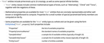 - Mathematical properties are available for most "Knot" entities that are concisely representable and either well known or straightforward to compute. Properties for a small number of special parametrized family members are computed on the fly.