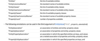 "EntityAssociation" an association of entities and entity-property values "PropertyAssociation" an association of properties and entity-property values "EntityPropertyAssociation" an association in which the specified entities are keys, and values are a nested association of properties and entity-property values "PropertyEntityAssociation" an association in which the specified properties are keys, and values are a nested association of entities and entity-property values "Dataset" a dataset in which the specified entities are keys, and values are an association of property names and entity-property values - The following annotations can be used in the second argument of EntityValue[property,annotation]: