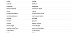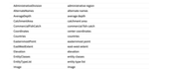 AdministrativeDivision administrative region AlternateNames alternate names AverageDepth average depth CatchmentArea catchment area CommercialFishCatch commercial fish catch Coordinates center coordinates Countries countries EasternmostPoint easternmost point EastWestExtent east‐west extent Elevation elevation EntityClasses entity classes EntityTypeList entity type list Image image Inflow inflow Latitude latitude Longitude longitude MaximumDepth maximum depth Name name NorthernmostPoint northernmost point NorthSouthExtent north‐south extent Outflow outflow Position position Salinity typical salinity ShoreLength shore length SouthernmostPoint southernmost point SurfaceArea surface area Type type Volume volume WaterLevelFluctuation water level fluctuation WaterResidenceTime water residence time WesternmostPoint westernmost point