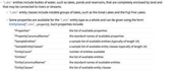 - Some properties are available for the "Lake" entity type as a whole and can be given using the form EntityValue["Lake",property]. Such properties include: