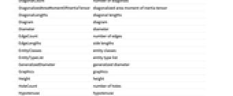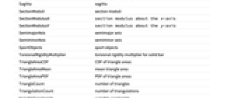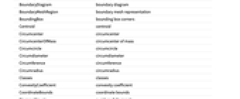 SemimajorAxis semimajor axis SemiminorAxis semiminor axis SportObjects sport objects TorsionalRigidityMultiplier torsional rigidity multiplier for solid bar TriangleAreaCDF CDF of triangle areas TriangleAreaMean mean triangle area TriangleAreaPDF PDF of triangle areas TriangleCount number of triangles TriangulationCount number of triangulations VariableConstraints variable constraints VariableDescriptions variable descriptions Variables variables VertexCount number of vertices Vertices vertices