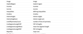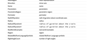 AreaMomentOfInertiaZZ polar moment of inertia AssociatedEntities associated entities AssociatedPeople associated people Boundary boundary BoundaryCurve boundary curve BoundaryDiagram boundary diagram BoundaryMeshRegion boundary mesh representation BoundingBox bounding box corners Centroid centroid Circumcenter circumcenter CircumcenterOfMass circumcenter of mass Circumcircle circumcircle Circumdiameter circumdiameter Circumference circumference Circumradius circumradius Classes classes ConvexityCoefficient convexity coefficient CoordinateBounds coordinate bounds DiagonalCount number of diagonals DiagonalizedAreaMomentOfInertiaTensor diagonalized area moment of inertia tensor DiagonalLengths diagonal lengths Diagram diagram Diameter diameter EdgeCount number of edges EdgeLengths side lengths EntityClasses entity classes EntityTypeList entity type list GeneralizedDiameter generalized diameter Graphics graphics Height height HoleCount number of holes Hypotenuse hypotenuse Image image ImplicitRegion implicit region Incenter incenter Incircle incircle Inequalities defining inequalities Inradius inradius InteriorAngles interior angles InteriorAngleSum interior angle sum LineOfSymmetryCount number of lines of symmetry LineSegmentLengthCDF CDF of lengths LineSegmentLengthMean mean line segment length LineSegmentLengthPDF PDF of lengths MajorAxis major axis MeshRegion mesh representation MinorAxis minor axis Name name Parameters parameters ParametricRegion parametric region Perimeter perimeter RadiiOfGyration radii of gyration about coordinate axes Radius radius RadiusOfGyrationX