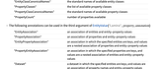 "EntityAssociation" an association of entities and entity-property values "PropertyAssociation" an association of properties and entity-property values "EntityPropertyAssociation" an association in which the specified entities are keys, and values are a nested association of properties and entity-property values "PropertyEntityAssociation" an association in which the specified properties are keys, and values are a nested association of entities and entity-property values "Dataset" a dataset in which the specified entities are keys, and values are an association of property names and entity-property values - The following annotations can be used in the second argument of EntityValue[property,annotation]: