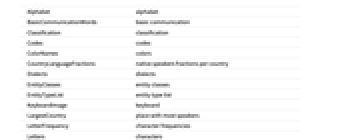 Alphabet alphabet BasicCommunicationWords basic communication Classification classification Codes codes ColorNames colors CountryLanguageFractions native speakers fractions per country Dialects dialects EntityClasses entity classes EntityTypeList entity type list KeyboardImage keyboard LargestCountry place with most speakers LetterFrequency character frequencies Letters characters LexicalSimilarity lexical similarity MonthNames months Name name NativePopulation total number of native speakers NativeSpeakers native speakers NonNativeTotalSpeakers total number of non-native speakers NumeralWords numerals OfficialSpeakingCountries official speaking countries PrimaryOrigin original location Pronouns pronouns RelativeCharacterCount typical translation length RootFamily root family Siblings siblings Speakers speakers SubLabel sub‐label TotalSpeakers total number of speakers UnicodeBlock Unicode blocks WikipediaArticleCount Wikipedia size WritingScripts writing scripts