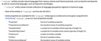 - Some properties are available for the "Language" entity type as a whole and can be given using the form EntityValue["Language",property]. Such properties include: