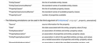 "Properties" the list of available properties "PropertyCanonicalNames" the standard names of available properties "SampleEntities" a sample list of available entities (typically of length 10) "SampleEntityClasses" a sample list of available entity classes (typically of length 10) "EntityCount" number of entities available "Entities" the list of available entities "EntityCanonicalNames" the standard names of available entities "EntityClasses" the list of available entity classes "EntityClassCanonicalNames" the standard names of available entity classes "PropertyClasses" the list of available property classes "PropertyClassCanonicalNames" the standard names of available property classes "PropertyCount" number of properties available - The following annotations can be used in the third argument of EntityValue["Language",property,annotation]: