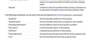 "Qualifiers" the list of possible qualifiers for the property "QualifierValues" the list of possible values that can be given to each qualifier "DefaultQualifierValues" the list of default values for the property's qualifiers "Description" a brief textual description of the property "Definition" a detailed textual definition of the property "PhysicalQuantity" the physical quantity associated with the entity-property value "Unit" the unit associated with the entity-property value - A qualifier value of Automatic indicates that an applicable format of values can be used; e.g. for the "Date" qualifier, this includes a proper date or date span.