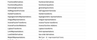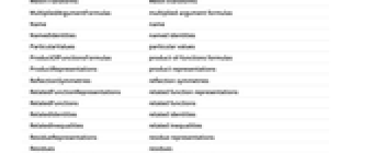 AdditionFormulas addition formulas AlternativeRepresentations alternative representations ArgumentPattern argument pattern ArgumentSimplifications argument simplifications AsymptoticExpansions asymptotic expansions Classes classes ComplexCharacteristics complex characteristics ContinuedFractionRepresentations continued fraction representations DifferenceEquations difference equations DifferentialEquations differential equations EntityClasses entity classes EntityTypeList entity type list FourierTransforms Fourier transforms FractionalDerivatives fractional derivatives FunctionalEquations functional equations GeneratingFunctions generating functions HalfArgumentFormulas half‐argument formulas HankelTransforms Hankel transforms HypergeometricRepresentations hypergeometric representations IntegralRepresentations integral representations InverseFourierTransforms inverse Fourier transforms InverseFunctionRelations inverse function relations LaplaceTransforms Laplace transforms LimitRepresentations limit representations LowOrderDerivatives low‐order derivatives MeijerGRepresentations